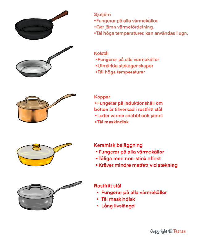 Pannor tillverkade i koppar leder värme bäst. I denna typ av pannor sprids värmen snabbt och jämnt vilket gör att du kan laga mat på låg till medelhög temperatur med god effekt. Koppar i sig är inte magnetiskt, men de flesta pannor har en bottenplatta som är innesluten i rostfritt stål vilket gör att de i så fall även kan användas även på induktionshällar.