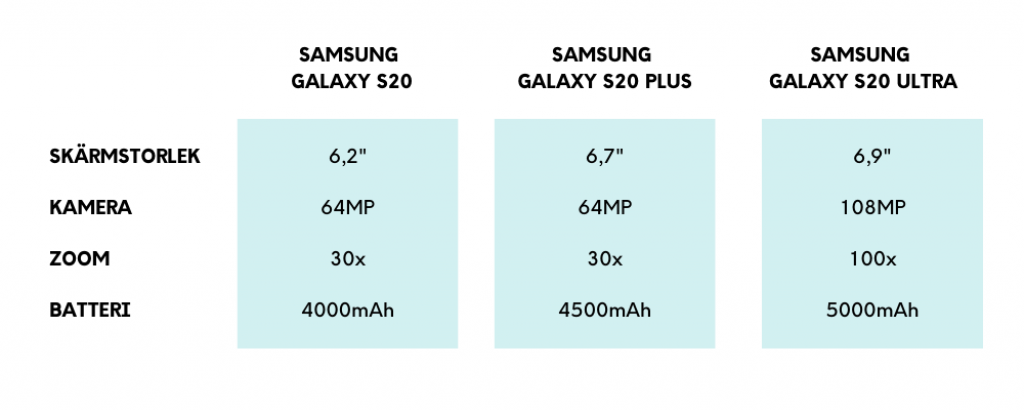 I mitten av mars 2020 lanseras tre nya modeller från Samsung: Samsung Galaxy S20, Samsung Galaxy S20 Plus, Samsung Galaxy S20 Ultra. Samsung Galaxy Z Flip kommer redan i februari. De tre första modellerna är mer eller mindre vanliga smartphones fast med nya maxade funktionaliteter och förbättringar. Den sistnämnda, Galaxy Z Flip är dock något utöver det vanliga. Som namnet avslöjar, är mobilen vikbar. Du kan alltså böja skärmen och vika ihop den, likt tidigare mobiler man kommer ihåg innan smartphones "kom till". Frågan är om den kommer bli en storsäljare eller en flopp? Vi på test.se är imponerade av alla modellerna och tror att Samsung S20 kommer bli den nya favoriten. Kameran är den största nyheten, den bästa hittills! Mobilerna är dessutom redo för 5G.