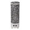 Det här snygga bastuaggregatet passar för en bastuvolym på sex till tio kubikmeter och rymmer en stenmängd på 80 kilo, som köps separat. Bastuaggregatet har ett ytterhölje med rostfritt stål och en fast styrenhet placerad på aggregatets framsida. På styrenheten finns en termostat som du reglerar med värmen med och en timer där du kan starta, stänga av eller förinställa av den.